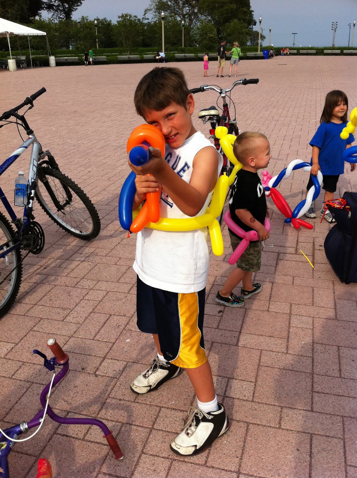 So on Father's day, we Buenzow's went into the big wonderful city. We brought our bikes with us to go on a bike ride with the Taylor's. Let me tell you. it was a GREAT day. We rode for 6.83 miles!!!!!!! and took all afternoon. First we had lunch at Kroll's. Next we went past soldier field to Northerly island and rode around that park with a stop at the tip to watch the big boats go in and out of the harbor. next we headed by the field museum for a little play time on the big hill before getting some snacks at the ice cream window. Next we rode to Buckingham fountain where the kids all got great fun balloon swords and funny hats. On our way home we stopped at the park by the school in Lisa's 'hood. Finally we made it home 6 hours after we left! Emily and Ethan rode there bikes the WHOLE time without any complaints. WOW. Emmit had a relaxing ride watching Micah's butt on his bike seat behind Micah. It was the best father's day EVER :)